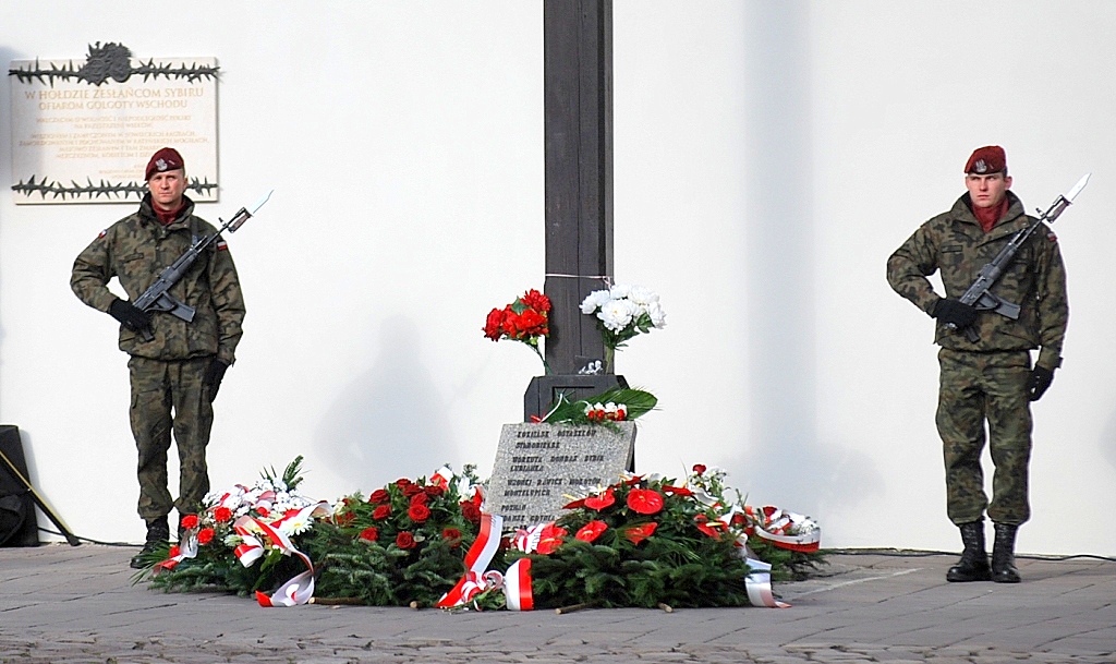 Krzyż Katyński. Tu zapoczątkowano Marsz od złożenia kwiatów, a pierwszym był wojewoda Józef Pilch, który od tego roku przywłaszczył sobie organizację Święta Niepodległości w Krakowie, tym samym odbierając do tego prawo Prezydentowi Miasta Krakowa.